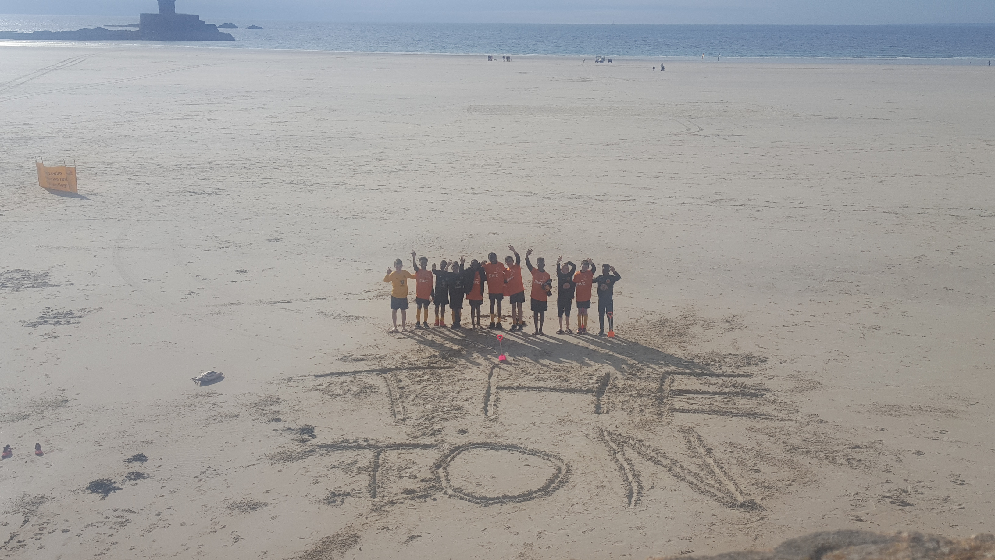 There was still time on the clock after Pizza Hut for one final game of football. A mammoth game of beach football entertained the boys for a couple of hours and capped off a brilliant second half to the week on the pitch. Before heading back to the hotel, the boys left their mark on the sands of Jersey by writing their name on the beach. I’m certain their name will be remembered long after the sea has washed away the sands in which they wrote a The Ton!
